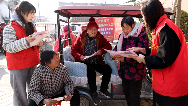 商丘市柘城县“柘礼新风”系列文明实践集中示范性活动现场,志愿者向村民发放移风易俗宣传册。