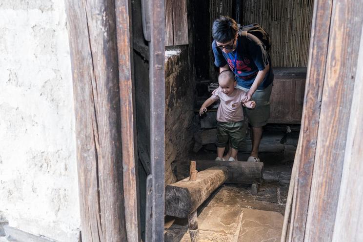 7月16日,游客正在体验湖南省湘西土家族苗族自治州凤凰县竹山村的传统舂碓舂玉米的制作过程。新华网 钟奕 摄