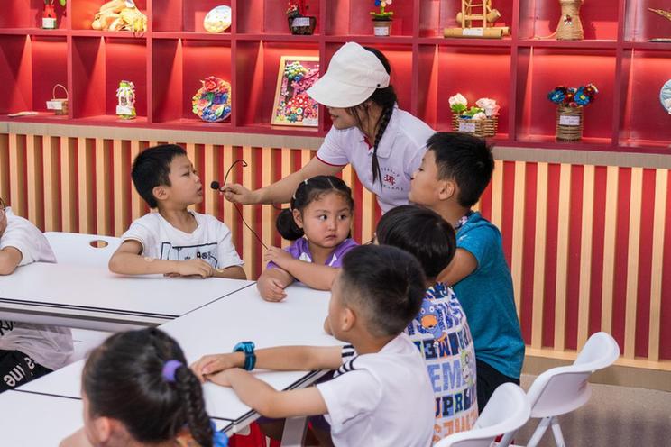 7月16日,湖南省湘西土家族苗族自治州吉首市新时代文明实践中心举办的垃圾分类志愿服务小讲堂,志愿者正在就垃圾分类向小朋友提问。新华网 钟奕 摄