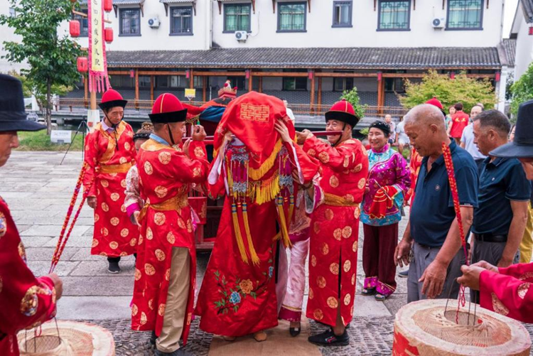 8月31日,在浙江省金华市东阳市湖溪镇镇西村新时代文明实践简约婚礼基地——马上桥花厅,正在举办传统婚礼仪式,倡导年轻人继承传统、简约办婚。新华网 钟奕摄