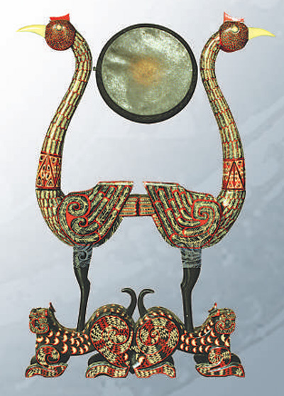 乐器是礼器的重要组成部分。楚地出土乐器繁多,八音齐全。出土于楚文化中心区域的虎座凤鸟架鼓多达30余件,武王墩墓亦见虎座凤鸟架鼓,这是楚文化中最具象征性的器物之一。虎座凤鸟架鼓是悬鼓的一种形式。悬鼓是与编钟编磬配合使用的重要乐器,“钟鼓齐”“鼓乐大作”中的鼓具有突出作用。虎座凤鸟架鼓的底座以伏卧的双虎为支撑,虎背上站立着的两只凤都是单脚,凤与凤之间的空间处于中心位置,鼓就悬挂其中,整体造型寓动于静、静中有动。