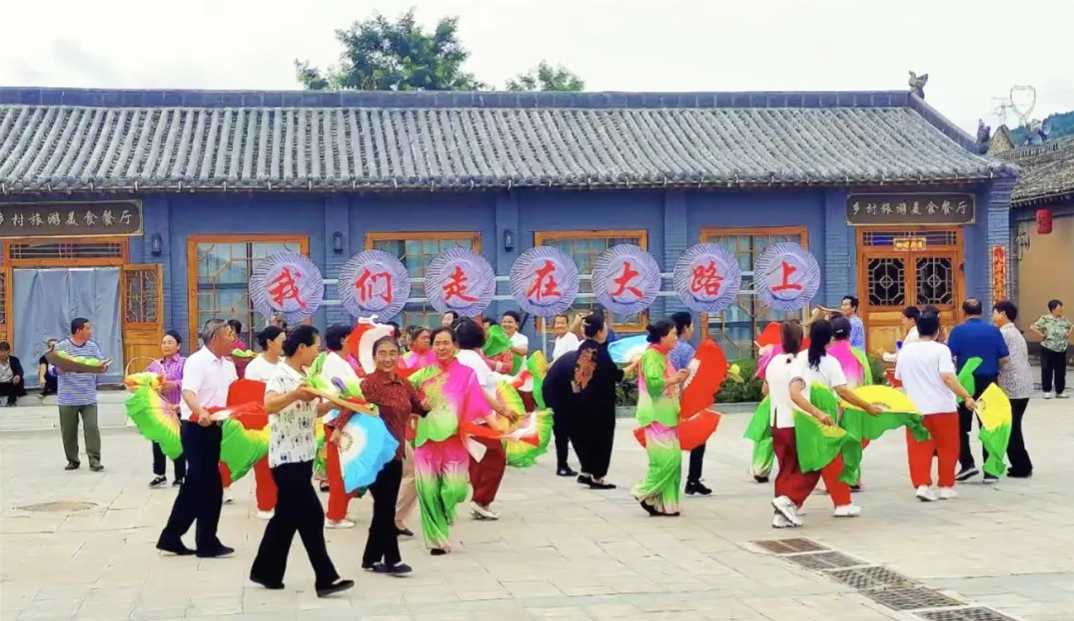 8月8日,在岢岚宋家沟村文化大院,乡村小剧场年代秀《我们走在大路上》正精彩上演。新华网发(忻州广播电视台 王鹏宇 摄)