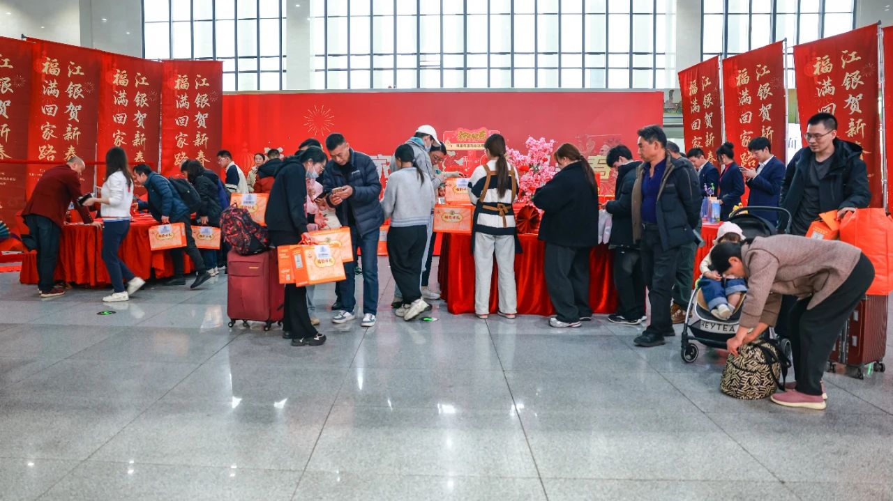春运期间,南昌火车站“送福回家路 非遗迎新春”活动现场,旅客带着春联回家。